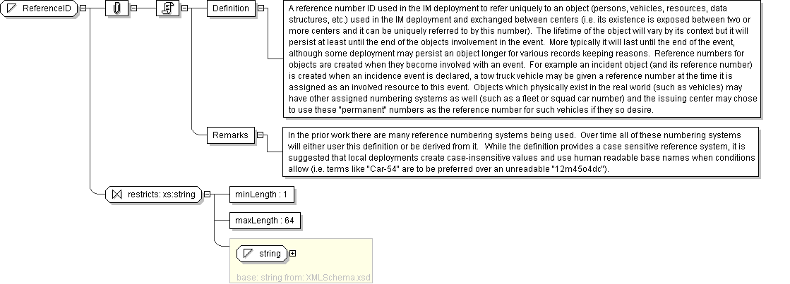 <Definition> A reference number ID used in the IM deployment to refer uniquely to an object (persons, vehicles, resources, data structures, etc.) used in the IM deployment and exchanged between centers (i.e. its existence is exposed between two or more centers and it can be uniquely referred to by this number). The lifetime of the object will vary by its context but it will persist at least until the end of the objects involvement in the event. More typically it will last until the end of the event, although some deployment may persist an object longer for various records keeping reasons. Reference numbers for objects are created when they become involved with an event. For example an incident object (and its reference number) is created when an incidence event is declared, a tow truck vehicle may be given a reference number at the time it is assigned as an involved resource to this event. Objects which physically exist in the real world (such as vehicles) may have other assigned numbering systems as well (such as a fleet or squad car number) and the issuing center may chose to use these "permanent" numbers as the reference number for such vehicles if they so desire.</Definition>