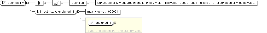 | Documentation | <Definition> Surface visibility measured in one tenth of a meter. The value 1000001 shall indicate an error condition or missing value.</Definition> |