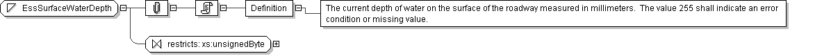 | Documentation | <Definition> The current depth of water on the surface of the roadway measured in millimeters. The value 255 shall indicate an error condition or missing value.</Definition> |