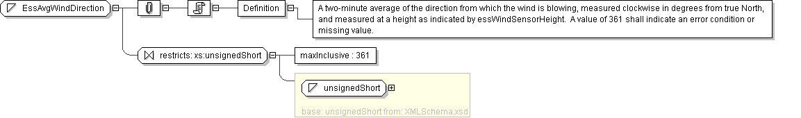 | Documentation | <Definition> A two-minute average of the direction from which the wind is blowing, measured clockwise in degrees from true North, and measured at a height as indicated by essWindSensorHeight. A value of 361 shall indicate an error condition or missing value.</Definition> |
