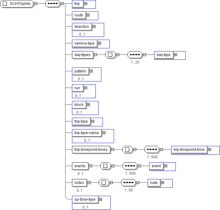 | Used by (from the same schema document) | Complex Type SchPushRouteSchedule , Complex Type SchPushRouteSchedule , Complex Type SchRouteSchedule , Complex Type SchRouteSchedule , Complex Type SCHBlockScheduleEntry , Complex Type SCHPTVRouteScheduleEntry , Complex Type SCHPTVRouteScheduleEntry , Complex Type SCHRunScheduleEntry , Complex Type SCHTripDetailInfo |