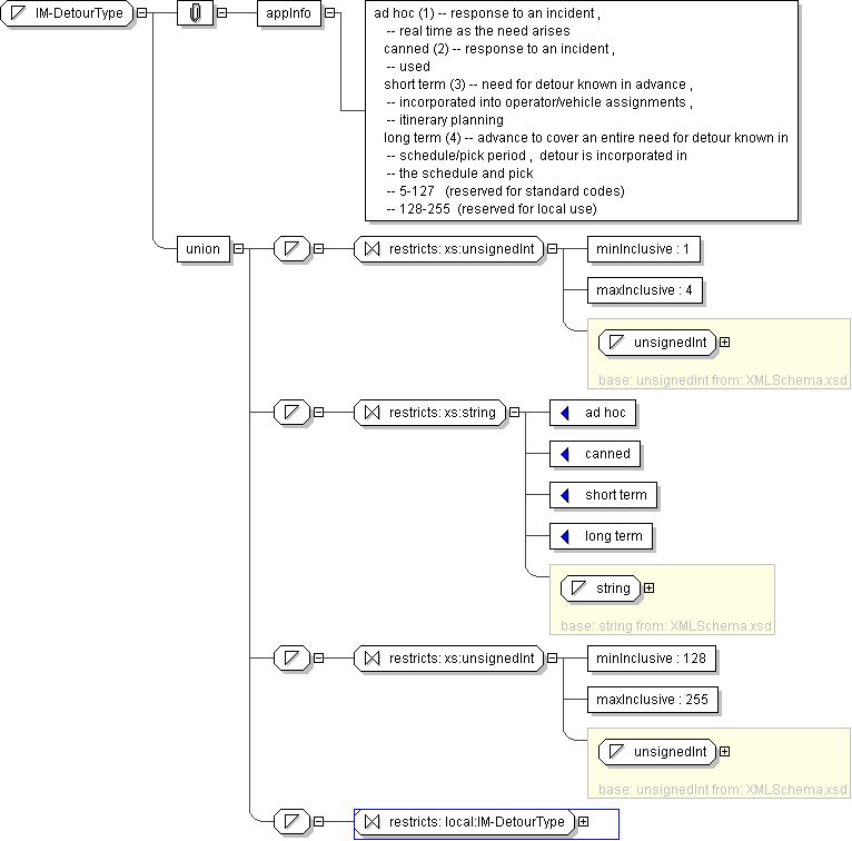 | Application Data | ad hoc (1) -- response to an incident , -- real time as the need arises canned (2) -- response to an incident , -- used short term (3) -- need for detour known in advance , -- incorporated into operator/vehicle assignments , -- itinerary planning long term (4) -- advance to cover an entire need for detour known in -- schedule/pick period , detour is incorporated in -- the schedule and pick -- 5-127 (reserved for standard codes) -- 128-255 (reserved for local use) |