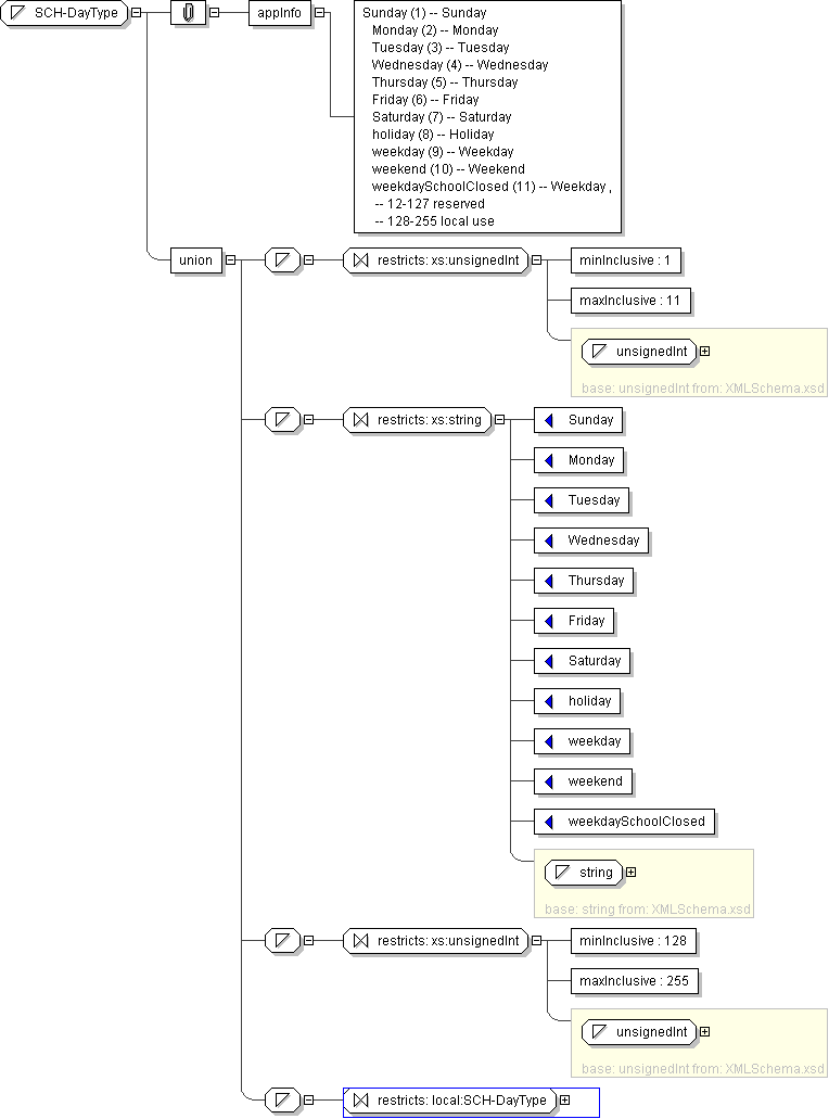 | Used by (from the same schema document) | Complex Type CCTripCancellationRecord , Complex Type FCDayDefinition , Complex Type FCFareDefinitionRecord , Complex Type FCFarePolicyRecord , Complex Type PIAvailablePeriod , Complex Type PICustSubscription , Complex Type PIPublishedScheduleTable , Complex Type PIRecurringTrip , Complex Type PIXMLTimetable , Complex Type SCHBlockScheduleEntry , Complex Type SCHCalendarEntry , Complex Type SCHOperatorAssignment , Complex Type SCHRunningTimeEntry , Complex Type SCHRunScheduleEntry , Complex Type SCHServiceAtStop , Complex Type SCHTrip , Complex Type SCHTripInfo , Complex Type SCHVehicleAssignment |