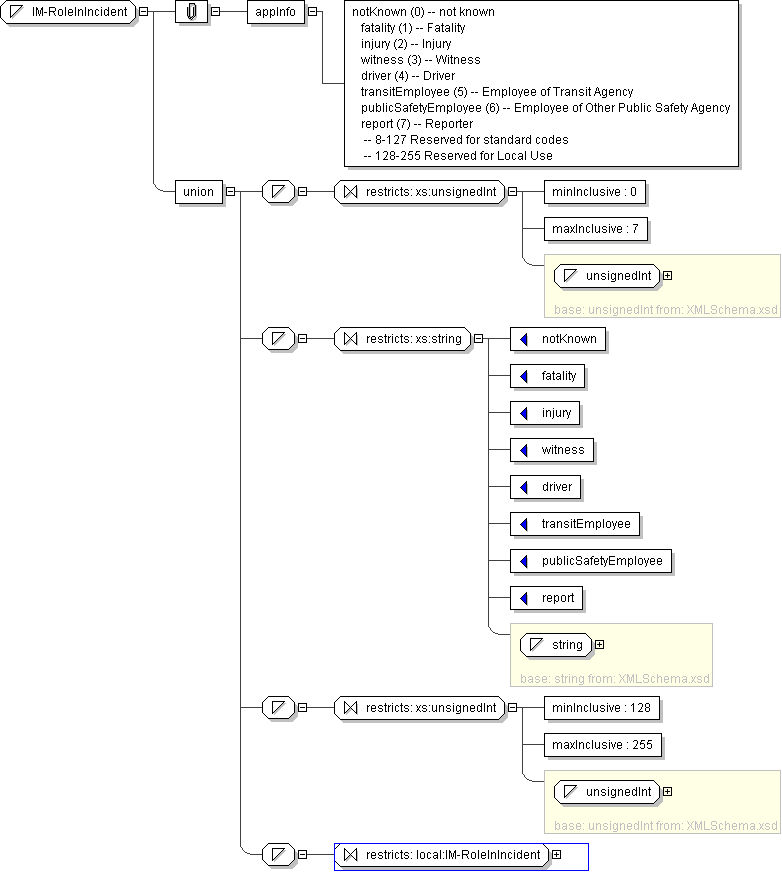 | Application Data | notKnown (0) -- not known fatality (1) -- Fatality injury (2) -- Injury witness (3) -- Witness driver (4) -- Driver transitEmployee (5) -- Employee of Transit Agency publicSafetyEmployee (6) -- Employee of Other Public Safety Agency report (7) -- Reporter -- 8-127 Reserved for standard codes -- 128-255 Reserved for Local Use |