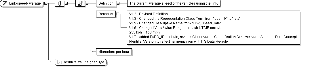 | Documentation | <Definition> The current average speed of the vehicles using the link.</Definition> <Remarks> V1.2 - Revised Definition. V1.3 - Changed the Representation Class Term from "quantity" to "rate". V1.5 - Changed Descriptive Name from "Link_Speed_rate" V1.6 - Changed Valid Value Range to match NTCIP format. 255 kph = 158 mph V1.7 - Added FADD_ID attribute; revised Class Name, Classification Scheme Name/Version, Data Concept Identifier/Version to reflect harmonization with ITS Data Registry.</Remarks> kilometers per hour |