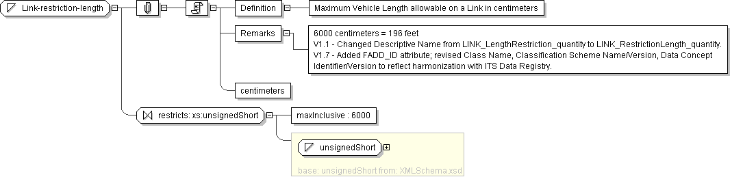| Documentation | <Definition> Maximum Vehicle Length allowable on a Link in centimeters</Definition> <Remarks> 6000 centimeters = 196 feet V1.1 - Changed Descriptive Name from LINK_LengthRestriction_quantity to LINK_RestrictionLength_quantity. V1.7 - Added FADD_ID attribute; revised Class Name, Classification Scheme Name/Version, Data Concept Identifier/Version to reflect harmonization with ITS Data Registry.</Remarks> centimeters |