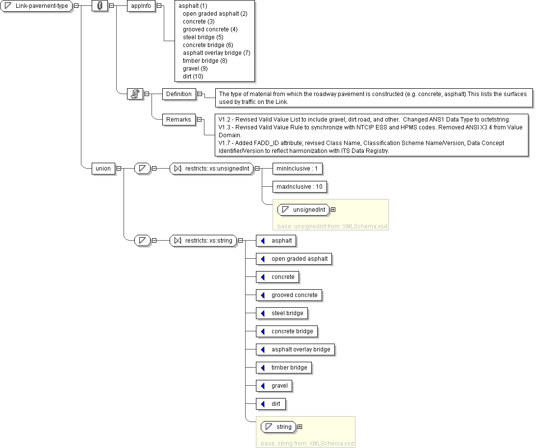 | Documentation | <Definition> The type of material from which the roadway pavement is constructed (e.g. concrete, asphalt).This lists the surfaces used by traffic on the Link.</Definition> <Remarks> V1.2 - Revised Valid Value List to include gravel, dirt road, and other. Changed ANS1 Data Type to octetstring. V1.3 - Revised Valid Value Rule to synchronize with NTCIP ESS and HPMS codes. Removed ANSI X3.4 from Value Domain. V1.7 - Added FADD_ID attribute; revised Class Name, Classification Scheme Name/Version, Data Concept Identifier/Version to reflect harmonization with ITS Data Registry.</Remarks> |