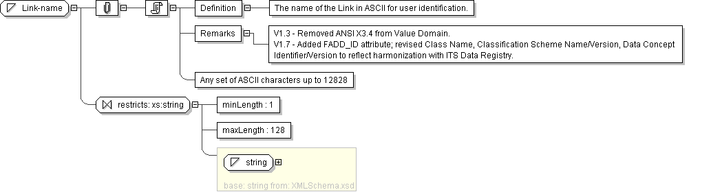 | Documentation | <Definition> The name of the Link in ASCII for user identification.</Definition> <Remarks> V1.3 - Removed ANSI X3.4 from Value Domain. V1.7 - Added FADD_ID attribute; revised Class Name, Classification Scheme Name/Version, Data Concept Identifier/Version to reflect harmonization with ITS Data Registry.</Remarks> Any set of ASCII characters up to 12828 |
