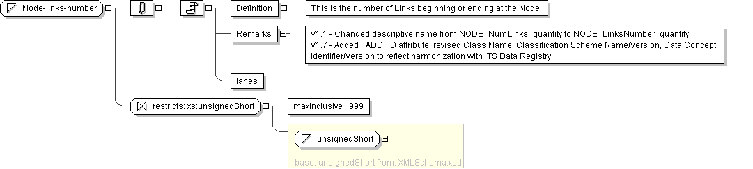 | Documentation | <Definition> This is the number of Links beginning or ending at the Node.</Definition> <Remarks> V1.1 - Changed descriptive name from NODE_NumLinks_quantity to NODE_LinksNumber_quantity. V1.7 - Added FADD_ID attribute; revised Class Name, Classification Scheme Name/Version, Data Concept Identifier/Version to reflect harmonization with ITS Data Registry.</Remarks> lanes |