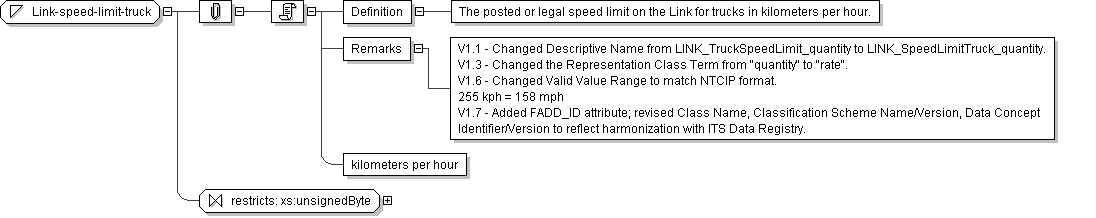 | Documentation | <Definition> The posted or legal speed limit on the Link for trucks in kilometers per hour.</Definition> <Remarks> V1.1 - Changed Descriptive Name from LINK_TruckSpeedLimit_quantity to LINK_SpeedLimitTruck_quantity. V1.3 - Changed the Representation Class Term from "quantity" to "rate". V1.6 - Changed Valid Value Range to match NTCIP format. 255 kph = 158 mph V1.7 - Added FADD_ID attribute; revised Class Name, Classification Scheme Name/Version, Data Concept Identifier/Version to reflect harmonization with ITS Data Registry.</Remarks> kilometers per hour |
