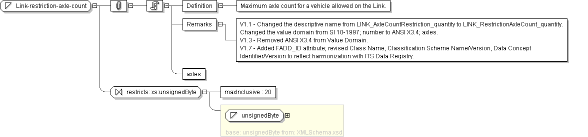 | Documentation | <Definition> Maximum axle count for a vehicle allowed on the Link.</Definition> <Remarks> V1.1 - Changed the descriptive name from LINK_AxleCountRestriction_quantity to LINK_RestrictionAxleCount_quantity. Changed the value domain from SI 10-1997; number to ANSI X3.4; axles. V1.3 - Removed ANSI X3.4 from Value Domain. V1.7 - Added FADD_ID attribute; revised Class Name, Classification Scheme Name/Version, Data Concept Identifier/Version to reflect harmonization with ITS Data Registry.</Remarks> axles |