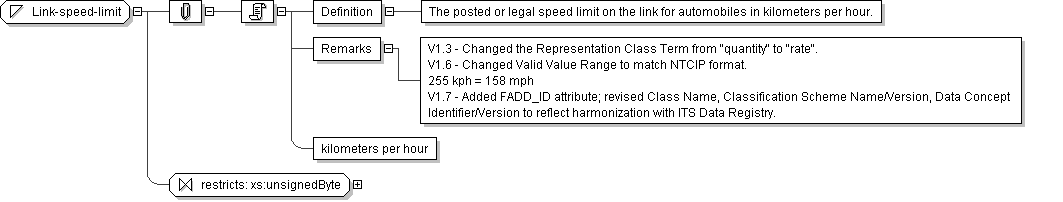 | Documentation | <Definition> The posted or legal speed limit on the link for automobiles in kilometers per hour.</Definition> <Remarks> V1.3 - Changed the Representation Class Term from "quantity" to "rate". V1.6 - Changed Valid Value Range to match NTCIP format. 255 kph = 158 mph V1.7 - Added FADD_ID attribute; revised Class Name, Classification Scheme Name/Version, Data Concept Identifier/Version to reflect harmonization with ITS Data Registry.</Remarks> kilometers per hour |