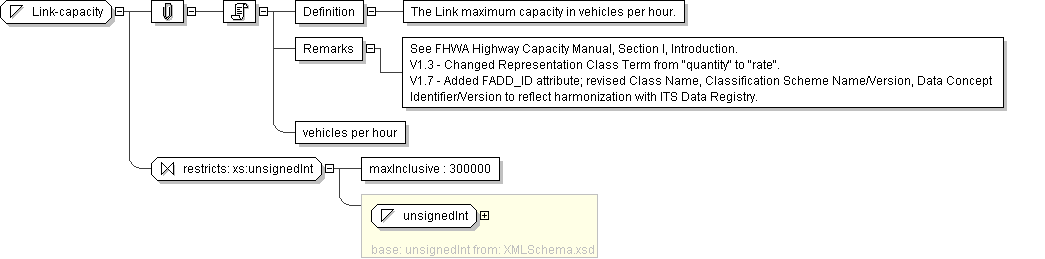 | Documentation | <Definition> The Link maximum capacity in vehicles per hour.</Definition> <Remarks> See FHWA Highway Capacity Manual, Section I, Introduction. V1.3 - Changed Representation Class Term from "quantity" to "rate". V1.7 - Added FADD_ID attribute; revised Class Name, Classification Scheme Name/Version, Data Concept Identifier/Version to reflect harmonization with ITS Data Registry.</Remarks> vehicles per hour |