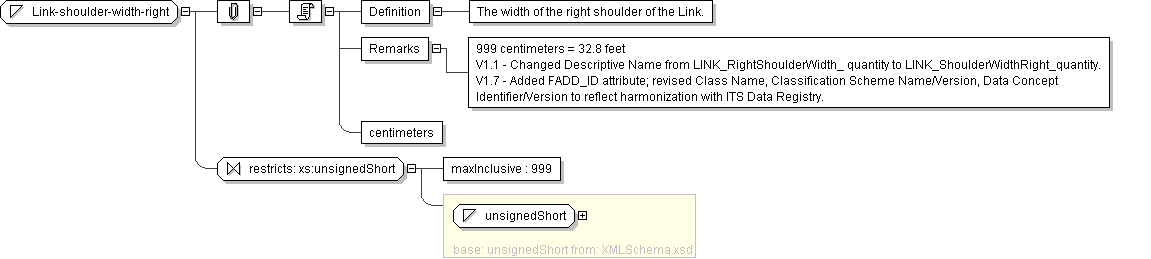 | Documentation | <Definition> The width of the right shoulder of the Link.</Definition> <Remarks> 999 centimeters = 32.8 feet V1.1 - Changed Descriptive Name from LINK_RightShoulderWidth_ quantity to LINK_ShoulderWidthRight_quantity. V1.7 - Added FADD_ID attribute; revised Class Name, Classification Scheme Name/Version, Data Concept Identifier/Version to reflect harmonization with ITS Data Registry.</Remarks> centimeters |