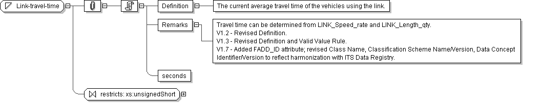 | Documentation | <Definition> The current average travel time of the vehicles using the link.</Definition> <Remarks> Travel time can be determined from LINK_Speed_rate and LINK_Length_qty. V1.2 - Revised Definition. V1.3 - Revised Definition and Valid Value Rule. V1.7 - Added FADD_ID attribute; revised Class Name, Classification Scheme Name/Version, Data Concept Identifier/Version to reflect harmonization with ITS Data Registry.</Remarks> seconds |