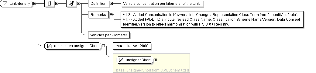 | Documentation | <Definition> Vehicle concentration per kilometer of the Link.</Definition> <Remarks> V1.3 - Added Concentration to Keyword list. Changed Representation Class Term from "quantity" to "rate". V1.7 - Added FADD_ID attribute; revised Class Name, Classification Scheme Name/Version, Data Concept Identifier/Version to reflect harmonization with ITS Data Registry.</Remarks> vehicles per kilometer |