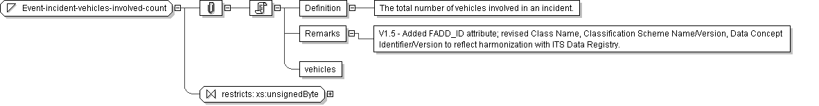 | Documentation | <Definition> The total number of vehicles involved in an incident.</Definition> <Remarks> V1.5 - Added FADD_ID attribute; revised Class Name, Classification Scheme Name/Version, Data Concept Identifier/Version to reflect harmonization with ITS Data Registry.</Remarks> vehicles |