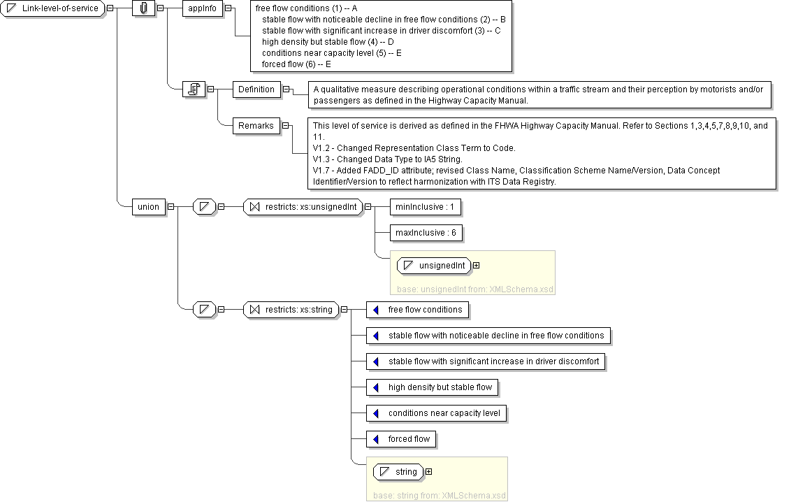 | Documentation | <Definition> A qualitative measure describing operational conditions within a traffic stream and their perception by motorists and/or passengers as defined in the Highway Capacity Manual.</Definition> <Remarks> This level of service is derived as defined in the FHWA Highway Capacity Manual. Refer to Sections 1,3,4,5,7,8,9,10, and 11. V1.2 - Changed Representation Class Term to Code. V1.3 - Changed Data Type to IA5 String. V1.7 - Added FADD_ID attribute; revised Class Name, Classification Scheme Name/Version, Data Concept Identifier/Version to reflect harmonization with ITS Data Registry.</Remarks> |