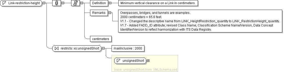 | Documentation | <Definition> Minimum vertical clearance on a Link in centimeters.</Definition> <Remarks> Overpasses, bridges, and tunnels are examples. 2000 centimeters = 65.6 feet. V1.1 - Changed the descriptive name from LINK_HeightRestriction_quantity to LINK_RestrictionHeight_quantity. V1.7 - Added FADD_ID attribute; revised Class Name, Classification Scheme Name/Version, Data Concept Identifier/Version to reflect harmonization with ITS Data Registry.</Remarks> centimeters |