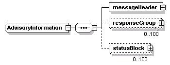 | source | <xs:complexType name="AdvisoryInformation"> <xs:sequence> <xs:element name="messageHeader" type="MessageHeader"/> <xs:element name="responseGroup" type="ResponseGroup" minOccurs="0" maxOccurs="100"/> <xs:element name="statusBlock" type="StatusBlock" minOccurs="0" maxOccurs="100"/> </xs:sequence> </xs:complexType> |