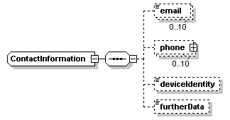 | source | <xs:complexType name="ContactInformation"> <xs:sequence> <xs:element name="email" type="Email" minOccurs="0" maxOccurs="10"/> <xs:element name="phone" type="PhoneInformation" minOccurs="0" maxOccurs="10"/> <!-- made up of country code , phone# , and ext and allow phones.fax.pager/etc to be entered --> <xs:element name="deviceIdentity" type="Device-Identity" minOccurs="0"/> <xs:element name="furtherData" type="im:ReferenceID" minOccurs="0"/> </xs:sequence> </xs:complexType> |