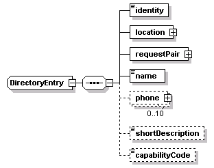 | source | <xs:complexType name="DirectoryEntry"> <xs:sequence> <xs:element name="identity" type="Identity"/> <xs:element name="location" type="lrms:LocationReference"/> <xs:element name="requestPair" type="DirectoryTypePair"/> <xs:element name="name" type="Name"/> <xs:element name="phone" type="PhoneInformation" minOccurs="0" maxOccurs="10"/> <xs:element name="shortDescription" type="ShortDescription" minOccurs="0"/> <xs:element name="capabilityCode" type="CapabilityCode" minOccurs="0"/> </xs:sequence> </xs:complexType> |
