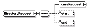 | source | <xs:complexType name="DirectoryRequest"> <xs:sequence> <xs:element name="coreRequest" type="DirectoryCoreRequest"/> <xs:element name="start" type="DateTimePair" minOccurs="0"/> <xs:element name="end" type="DateTimePair" minOccurs="0"/> </xs:sequence> </xs:complexType> |