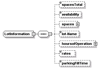 | source | <xs:complexType name="LotInformation"> <xs:sequence> <xs:element name="spacesTotal" type="tcip:PI-ParkingSpacesTotal" minOccurs="0"/> <xs:element name="availability" type="tcip:PI-ParkingAvailability" minOccurs="0"/> <xs:element name="spaces" type="ParkingSpaceTypes" minOccurs="0"/> <xs:element name="lot-Name" type="Lot-Name" minOccurs="0"/> <xs:element name="hoursofOperation" type="TimePair" minOccurs="0"/> <xs:element name="rates" type="tcip:PI-ParkingRates" minOccurs="0"/> <xs:element name="parkingFillTime" type="DateTimePair" minOccurs="0"/> </xs:sequence> </xs:complexType> |