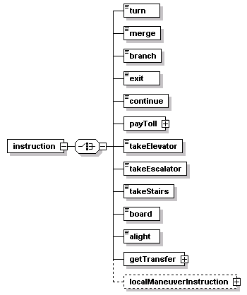 | source | <xs:element name="instruction"> <xs:complexType> <xs:choice> <xs:element name="turn" type="TurnType"/> <xs:element name="merge" type="TurnType"/> <xs:element name="branch" type="TurnType"/> <xs:element name="exit" type="TurnType"/> <xs:element name="continue" type="TurnType"/> <xs:element name="payToll" type="Cost"/> <xs:element name="takeElevator" type="VerticalType"/> <xs:element name="takeEscalator" type="VerticalType"/> <xs:element name="takeStairs" type="VerticalType"/> <xs:element name="board" type="Mode"/> <xs:element name="alight" type="Mode"/> <xs:element name="getTransfer" type="tcip:CPTStoppointIden"/> <xs:element name="localManeuverInstruction" type="local:ManeuverInstruction" minOccurs="0"/> </xs:choice> </xs:complexType> </xs:element> |