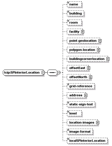| source | <xs:complexType name="SPInteriorLocation"> <xs:sequence> <xs:element name="name" type="SP-FeatureName" minOccurs="0"/> <xs:element name="building" type="SP-BuildingIdentifier" minOccurs="0"/> <xs:element name="room" type="SP-RoomIdentifier" minOccurs="0"/> <xs:element name="facility" type="CPTTransitFacilityIden" minOccurs="0"/> <xs:element name="point-geolocation" type="lrms:GeoLocation" minOccurs="0"/> <xs:element name="polygon-location" type="SPPolygon" minOccurs="0"/> <xs:element name="buildingcornerlocation" type="lrms:GeoLocation" minOccurs="0"/> <xs:element name="offsetEast" type="lrms:Distance" minOccurs="0"/> <xs:element name="offsetNorth" type="lrms:Distance" minOccurs="0"/> <xs:element name="grid-reference" type="SP-IndoorGridIdentifier" minOccurs="0"/> <xs:element name="address" type="lrms:AddressPoint" minOccurs="0"/> <xs:element name="static-sign-text" type="PI-StaticSignMessage" minOccurs="0"/> <xs:element name="level" type="lrms:VerticalLevel" minOccurs="0"/> <xs:element name="location-images" minOccurs="0"> <xs:complexType> <xs:sequence maxOccurs="10"> <xs:element name="location-image" type="PI-BinaryImageData"/> </xs:sequence> </xs:complexType> </xs:element> <xs:element name="image-format" type="PI-GraphicFormat" minOccurs="0"/> <xs:element name="localSPInteriorLocation" type="local:SPInteriorLocation" minOccurs="0"/> </xs:sequence> </xs:complexType> |
