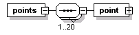 | source | <xs:element name="points"> <xs:complexType> <xs:sequence maxOccurs="20"> <xs:element name="point" type="SPNoDimPoint"/> </xs:sequence> </xs:complexType> </xs:element> |