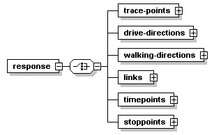 | source | <xs:element name="response"> <xs:complexType> <xs:choice> <xs:element name="trace-points"> <xs:complexType> <xs:sequence maxOccurs="100"> <xs:element name="trace-point" type="lrms:GeoLocation"/> </xs:sequence> </xs:complexType> </xs:element> <xs:element name="drive-directions"> <xs:complexType> <xs:sequence maxOccurs="100"> <xs:element name="drive-direction" type="atis:ManeuverInstruction"/> </xs:sequence> </xs:complexType> </xs:element> <xs:element name="walking-directions"> <xs:complexType> <xs:sequence maxOccurs="100"> <xs:element name="walking-direction" type="atis:ManeuverInstruction"/> </xs:sequence> </xs:complexType> </xs:element> <xs:element name="links"> <xs:complexType> <xs:sequence maxOccurs="100"> <xs:element name="link" type="SPLink"/> </xs:sequence> </xs:complexType> </xs:element> <xs:element name="timepoints"> <xs:complexType> <xs:sequence maxOccurs="50"> <xs:element name="timepoint" type="SCHTimepointIden"/> </xs:sequence> </xs:complexType> </xs:element> <xs:element name="stoppoints"> <xs:complexType> <xs:sequence maxOccurs="100"> <xs:element name="stoppoint" type="CPTStoppointIden"/> </xs:sequence> </xs:complexType> </xs:element> </xs:choice> </xs:complexType> </xs:element> |