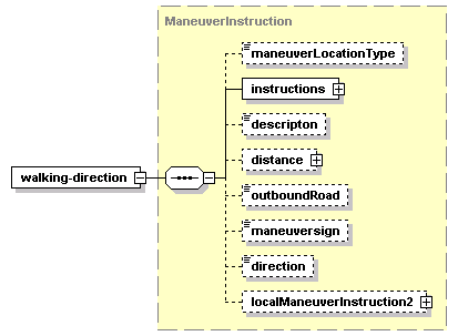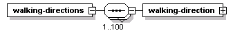 | source | <xs:element name="walking-directions"> <xs:complexType> <xs:sequence maxOccurs="100"> <xs:element name="walking-direction" type="atis:ManeuverInstruction"/> </xs:sequence> </xs:complexType> </xs:element> |