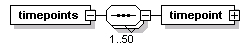 | source | <xs:element name="timepoints"> <xs:complexType> <xs:sequence maxOccurs="50"> <xs:element name="timepoint" type="SCHTimepointIden"/> </xs:sequence> </xs:complexType> </xs:element> |