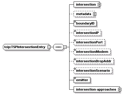 | source | <xs:complexType name="TSPIntersectionEntry"> <xs:sequence> <xs:element name="intersection" type="CPTIntersectionIden"/> <xs:element name="metadata" type="CPTRowMetaData" minOccurs="0"/> <xs:element name="boundaryID" type="TSP-BoundaryID"/> <xs:element name="intersectionIP" type="CPT-IP-Address" minOccurs="0"/> <xs:element name="intersectionPort" type="CPT-UDP-TCP-PortNumber" minOccurs="0"/> <xs:element name="intersectionModem" type="TSP-ModemPhoneNum" minOccurs="0"/> <xs:element name="intersectionDropAddr" type="TSP-DropAddr" minOccurs="0"/> <xs:element name="intersectionScenario" type="CPT-GenericCounter" minOccurs="0"/> <xs:element name="emitter" type="CPT-Boolean"/> <xs:element name="intersection-approaches"> <xs:complexType> <xs:sequence maxOccurs="10"> <xs:element name="intersection-approache" type="TSPTmsIntersectionApproach"/> </xs:sequence> </xs:complexType> </xs:element> </xs:sequence> </xs:complexType> |