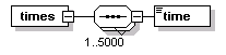| source | <xs:element name="times"> <xs:complexType> <xs:sequence maxOccurs="5000"> <xs:element name="time" type="SCH-Time"/> </xs:sequence> </xs:complexType> </xs:element> |