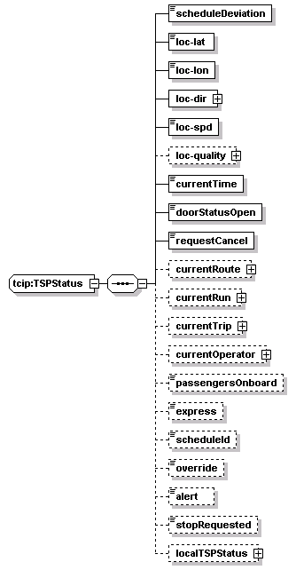 | source | <xs:complexType name="TSPStatus"> <xs:sequence> <xs:element name="scheduleDeviation" type="OB-ScheduleAdherenceOffset"/> <xs:element name="loc-lat" type="lrms:Latitude"/> <xs:element name="loc-lon" type="lrms:Longitude"/> <xs:element name="loc-dir" type="lrms:Angle"/> <xs:element name="loc-spd" type="OB-J1587-VelocityVectorSpeed"/> <xs:element name="loc-quality" type="SPDataQuality" minOccurs="0"/> <xs:element name="currentTime" type="CPT-DateTime"/> <xs:element name="doorStatusOpen" type="CPT-Boolean"/> <xs:element name="requestCancel" type="CPT-Boolean"/> <xs:element name="currentRoute" type="SCHRouteIden" minOccurs="0"/> <xs:element name="currentRun" type="SCHRunIden" minOccurs="0"/> <xs:element name="currentTrip" type="SCHTripIden" minOccurs="0"/> <xs:element name="currentOperator" type="CPTOperatorIden" minOccurs="0"/> <xs:element name="passengersOnboard" type="OB-J1587-PassengerCounterPatronCount" minOccurs="0"/> <xs:element name="express" type="CPT-Boolean" minOccurs="0"/> <xs:element name="scheduleId" type="SCH-TimetableVersionID" minOccurs="0"/> <xs:element name="override" type="CPT-Boolean" minOccurs="0"/> <xs:element name="alert" type="CPT-Boolean" minOccurs="0"/> <xs:element name="stopRequested" type="CPT-Boolean" minOccurs="0"/> <xs:element name="localTSPStatus" type="local:TSPStatus" minOccurs="0"/> </xs:sequence> </xs:complexType> |