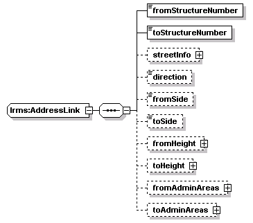 | source | <xs:complexType name="AddressLink"> <xs:sequence> <xs:element name="fromStructureNumber" type="Text-name255"/> <xs:element name="toStructureNumber" type="Text-name255"/> <xs:element name="streetInfo" type="StreetInfo" minOccurs="0"/> <xs:element name="direction" type="Direction" minOccurs="0"/> <xs:element name="fromSide" type="Side" minOccurs="0"/> <xs:element name="toSide" type="Side" minOccurs="0"/> <xs:element name="fromHeight" type="Height" minOccurs="0"/> <xs:element name="toHeight" type="Height" minOccurs="0"/> <xs:element name="fromAdminAreas" type="AdminAreaGroup" minOccurs="0"/> <xs:element name="toAdminAreas" type="AdminAreaGroup" minOccurs="0"/> </xs:sequence> </xs:complexType> |