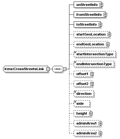| source | <xs:complexType name="CrossStreetsLink"> <xs:sequence> <xs:element name="onStreetInfo" type="StreetInfo"/> <xs:element name="fromStreetInfo" type="StreetInfo"/> <xs:element name="toStreetInfo" type="StreetInfo"/> <xs:element name="startGeoLocation" type="GeoLocation" minOccurs="0"/> <xs:element name="endGeoLocation" type="GeoLocation" minOccurs="0"/> <xs:element name="startIntersectionType" type="IntersectionType" minOccurs="0"/> <xs:element name="endIntersectionType" type="IntersectionType" minOccurs="0"/> <xs:element name="offset1" type="Distance" minOccurs="0"/> <xs:element name="offset2" type="Distance" minOccurs="0"/> <xs:element name="direction" type="Direction" minOccurs="0"/> <xs:element name="side" type="Side" minOccurs="0"/> <xs:element name="height" type="Height" minOccurs="0"/> <xs:element name="adminArea1" type="AdminAreaGroup" minOccurs="0"/> <xs:element name="adminArea2" type="AdminAreaGroup" minOccurs="0"/> </xs:sequence> </xs:complexType> |