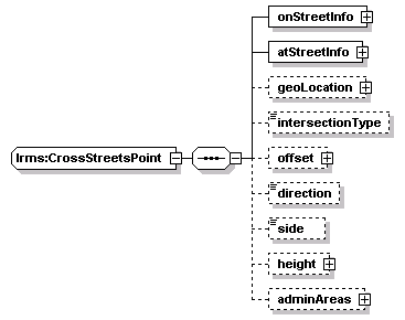 | source | <xs:complexType name="CrossStreetsPoint"> <xs:sequence> <xs:element name="onStreetInfo" type="StreetInfo"/> <xs:element name="atStreetInfo" type="StreetInfo"/> <xs:element name="geoLocation" type="GeoLocation" minOccurs="0"/> <xs:element name="intersectionType" type="IntersectionType" minOccurs="0"/> <xs:element name="offset" type="Distance" minOccurs="0"/> <xs:element name="direction" type="Direction" minOccurs="0"/> <xs:element name="side" type="Side" minOccurs="0"/> <xs:element name="height" type="Height" minOccurs="0"/> <xs:element name="adminAreas" type="AdminAreaGroup" minOccurs="0"/> </xs:sequence> </xs:complexType> |