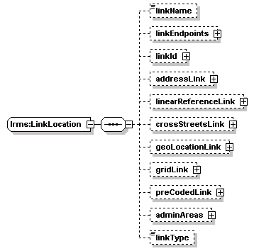 | source | <xs:complexType name="LinkLocation"> <xs:sequence> <xs:element name="linkName" type="Text-name255" minOccurs="0"/> <xs:element name="linkEndpoints" type="LinkGeneral" minOccurs="0"/> <xs:element name="linkId" type="IdType" minOccurs="0"/> <xs:element name="addressLink" type="AddressLink" minOccurs="0"/> <xs:element name="linearReferenceLink" type="LinearReference" minOccurs="0"/> <xs:element name="crossStreetsLink" type="CrossStreetsLink" minOccurs="0"/> <xs:element name="geoLocationLink" type="GeoLocationLink" minOccurs="0"/> <xs:element name="gridLink" type="GridPointPair" minOccurs="0"/> <xs:element name="preCodedLink" type="PreCoded" minOccurs="0"/> <xs:element name="adminAreas" type="AdminAreaGroup" minOccurs="0"/> <xs:element name="linkType" type="LinkType" minOccurs="0"/> </xs:sequence> <xs:attribute name="locationID" type="String-index64"/> </xs:complexType> |