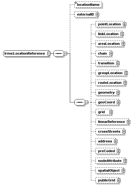 | source | <xs:complexType name="LocationReference"> <xs:sequence> <xs:element name="locationName" type="Text-name255" minOccurs="0"/> <xs:element name="externalID" type="IdType" minOccurs="0"/> <xs:sequence> <xs:element name="pointLocation" type="PointLocation" minOccurs="0"/> <xs:element name="linkLocation" type="LinkLocation" minOccurs="0"/> <xs:element name="areaLocation" type="AreaLocation" minOccurs="0"/> <xs:element name="chain" type="Chain" minOccurs="0"/> <xs:element name="transition" type="Transition" minOccurs="0"/> <xs:element name="groupLocation" type="GroupLocation" minOccurs="0"/> <xs:element name="routeLocation" type="RouteLocation" minOccurs="0"/> <xs:element name="geometry" type="Geometry" minOccurs="0"/> <xs:element name="geoCoord" type="GeoCoord" minOccurs="0"/> <xs:element name="grid" type="Grid" minOccurs="0"/> <xs:element name="linearReference" type="LinearReference" minOccurs="0"/> <xs:element name="crossStreets" type="CrossStreets" minOccurs="0"/> <xs:element name="address" type="Address" minOccurs="0"/> <xs:element name="preCoded" type="PreCoded" minOccurs="0"/> <xs:element name="nodeAttribute" type="NodeAttribute" minOccurs="0"/> <xs:element name="spatialObject" type="SpatialObject" minOccurs="0"/> <xs:element name="publicGrid" type="PublicGrid" minOccurs="0"/> </xs:sequence> </xs:sequence> <xs:attribute name="locationID" type="String-index64"/> </xs:complexType> |