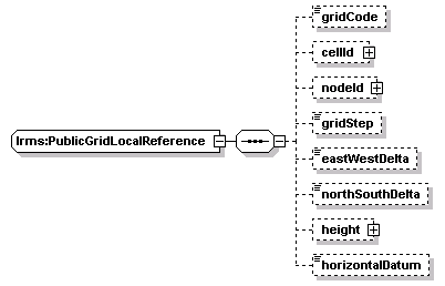 | source | <xs:complexType name="PublicGridLocalReference"> <xs:sequence> <xs:element name="gridCode" type="String-index64" minOccurs="0"/> <xs:element name="cellId" type="IdType" minOccurs="0"/> <xs:element name="nodeId" type="IdType" minOccurs="0"/> <xs:element name="gridStep" type="PublicGridGridStep" minOccurs="0"/> <xs:element name="eastWestDelta" type="PublicGridEastWestDelta" minOccurs="0"/> <xs:element name="northSouthDelta" type="PublicGridNorthSouthDelta" minOccurs="0"/> <xs:element name="height" type="Height" minOccurs="0"/> <xs:element name="horizontalDatum" type="HorizontalDatum" minOccurs="0"/> </xs:sequence> </xs:complexType> |