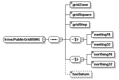 | source | <xs:complexType name="PublicGridUSNG"> <xs:sequence> <xs:element name="gridZone" type="PublicGridGridZone"/> <xs:element name="gridSquare" type="PublicGridGridSquare"/> <xs:element name="gridStep" type="PublicGridGridStep"/> <xs:choice> <xs:element name="easting16" type="PublicGridEasting16"/> <xs:element name="easting32" type="PublicGridEasting32"/> </xs:choice> <xs:choice> <xs:element name="northing16" type="PublicGridNorthing16"/> <xs:element name="northing32" type="PublicGridNorthing32"/> </xs:choice> <xs:element name="horDatum" type="HorizontalDatum" minOccurs="0"/> </xs:sequence> </xs:complexType> |