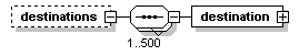 | source | <xs:element name="destinations" minOccurs="0"> <xs:complexType> <xs:sequence maxOccurs="500"> <xs:element name="destination" type="CCDestinationSignMessage"/> </xs:sequence> </xs:complexType> </xs:element> |