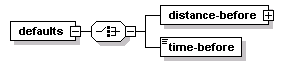 | source | <xs:element name="defaults"> <xs:complexType> <xs:choice> <xs:element name="distance-before" type="lrms:Distance"/> <xs:element name="time-before" type="CPT-Duration"/> </xs:choice> </xs:complexType> </xs:element> |
