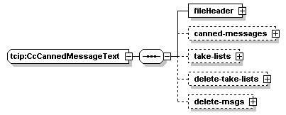 | source | <xs:complexType name="CcCannedMessageText"> <xs:sequence> <xs:element name="fileHeader" type="CPTLoadFileHeader"/> <xs:element name="canned-messages" minOccurs="0"> <xs:complexType> <xs:sequence maxOccurs="100"> <xs:element name="canned-message" type="CCCannedMsgDefinition"/> </xs:sequence> </xs:complexType> </xs:element> <xs:element name="take-lists" minOccurs="0"> <xs:complexType> <xs:sequence maxOccurs="100"> <xs:element name="take-list" type="CCTakeListDefinition"/> </xs:sequence> </xs:complexType> </xs:element> <xs:element name="delete-take-lists" minOccurs="0"> <xs:complexType> <xs:sequence maxOccurs="100"> <xs:element name="delete-take-list" type="CCTakeListDefinition"/> </xs:sequence> </xs:complexType> </xs:element> <xs:element name="delete-msgs" minOccurs="0"> <xs:complexType> <xs:sequence maxOccurs="100"> <xs:element name="delete-msg" type="CC-CannedMsgID"/> </xs:sequence> </xs:complexType> </xs:element> </xs:sequence> </xs:complexType> |