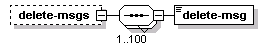 | source | <xs:element name="delete-msgs" minOccurs="0"> <xs:complexType> <xs:sequence maxOccurs="100"> <xs:element name="delete-msg" type="CC-CannedMsgID"/> </xs:sequence> </xs:complexType> </xs:element> |
