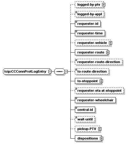 | source | <xs:complexType name="CCConnProtLogEntry"> <xs:sequence> <xs:element name="logged-by-ptv" type="CPTVehicleIden" minOccurs="0"/> <xs:element name="logged-by-appl" type="CPT-ApplicationID" minOccurs="0"/> <xs:element name="requester-id" type="CC-TravelerRequestID"/> <!-- assigned by requester entity --> <xs:element name="requester-time" type="CPT-DateTime"/> <!-- timerequested --> <xs:element name="requester-vehicle" type="CPTVehicleIden" minOccurs="0"/> <xs:element name="requester-route" type="SCHRouteIden"/> <xs:element name="requester-route-direction" type="lrms:Direction" minOccurs="0"/> <xs:element name="to-route-direction" type="lrms:Direction" minOccurs="0"/> <xs:element name="to-stoppoint" type="CPTStoppointIden"/> <xs:element name="requester-eta-at-stoppoint" type="CPT-DateTime" minOccurs="0"/> <xs:element name="requester-wheelchair" type="CPT-Boolean"/> <xs:element name="central-id" type="CC-TravelerRequestID"/> <xs:element name="wait-until" type="CPT-DateTime" minOccurs="0"/> <xs:element name="pickup-PTV" type="CPTVehicleIden" minOccurs="0"/> <xs:element name="dispositions"> <xs:complexType> <xs:sequence maxOccurs="3"> <xs:element name="disposition" type="CC-RequestDisposition"/> </xs:sequence> </xs:complexType> </xs:element> </xs:sequence> </xs:complexType> |