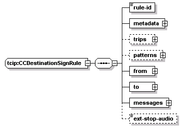 | source | <xs:complexType name="CCDestinationSignRule"> <xs:sequence> <xs:element name="rule-id" type="CPT-GenericCounter"/> <xs:element name="metadata" type="CPTRowMetaData"/> <xs:element name="trips" minOccurs="0"> <xs:complexType> <xs:sequence maxOccurs="1000"> <xs:element name="trip" type="SCHTripIden"/> </xs:sequence> </xs:complexType> </xs:element> <xs:element name="patterns" minOccurs="0"> <xs:complexType> <xs:sequence maxOccurs="1000"> <xs:element name="pattern" type="SCHPatternIden"/> </xs:sequence> </xs:complexType> </xs:element> <xs:element name="from"> <xs:complexType> <xs:choice> <xs:element name="timpoint" type="SCHTimepointIden"/> <xs:element name="location" type="lrms:GeoLocation"/> <xs:element name="event" type="SCH-ActivationID"/> </xs:choice> </xs:complexType> </xs:element> <xs:element name="to"> <xs:complexType> <xs:choice> <xs:element name="timepoint" type="SCHTimepointIden"/> <xs:element name="location" type="lrms:GeoLocation"/> <xs:element name="event" type="SCH-ActivationID"/> </xs:choice> </xs:complexType> </xs:element> <xs:element name="messages"> <xs:complexType> <xs:sequence maxOccurs="10"> <xs:element name="message" type="CC-DestinationMessageID"/> </xs:sequence> </xs:complexType> </xs:element> <xs:element name="ext-stop-audio" type="PI-BinaryAudioData" minOccurs="0"/> </xs:sequence> </xs:complexType> |